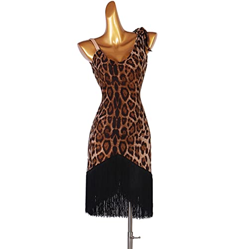 JRUIA Tassel Latin Training Dresses Printed Cha Cha Dancewear Women's Ballroom Performance Costume Leotard Skirt for Samba,Brown,L