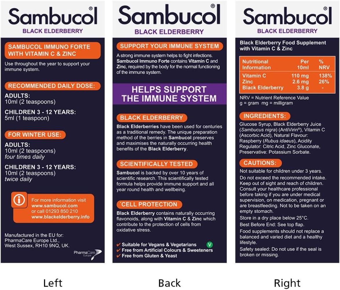 Sambucol Immuno Forte Black Elderberry Liquid Vitamin C + Zinc Vegan Pack 230ml