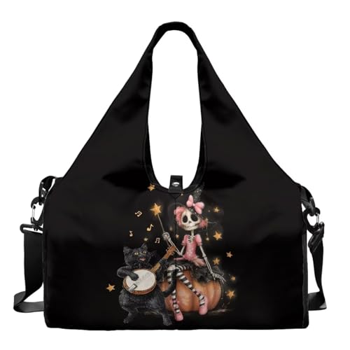 Dserfgiu Halloween Travel Carry On Bag for Women with Yoga Mat Holder Strap, Skeleton Gym Duffle Bag with Shoes Compartment, Wet Pocket, Gym Backpack Carring Workout Stuff Accessories