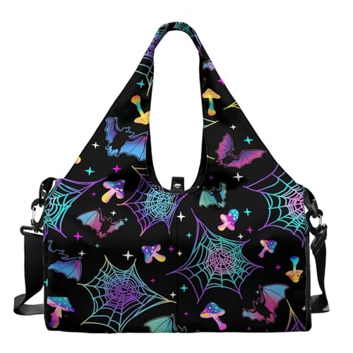 Dserfgiu Halloween Travel Carry On Bag for Women with Yoga Mat Holder Strap, Cobweb Gym Duffle Bag with Shoes Compartment, Wet Pocket, Gym Backpack Carring Workout Stuff Accessories