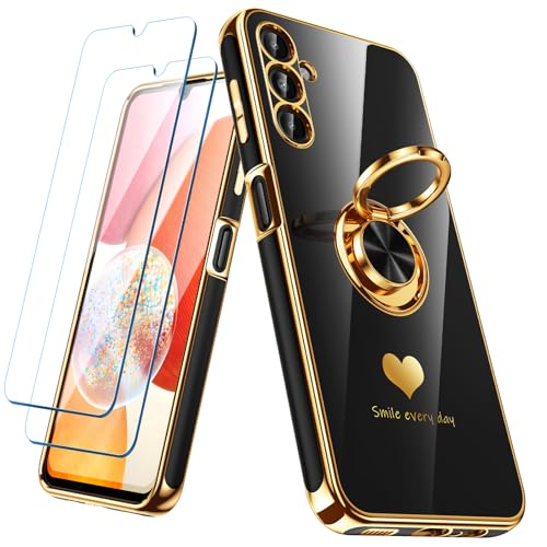 Nonional for Samsung Galaxy A14 5G/4G Case with 2 Pack Screen Protector, 360° Rotatable Ring Holder [Luxury Hearts Pattern] Plating Gold Edge Slim Soft Phone Cover Case for Galaxy A14 - Black