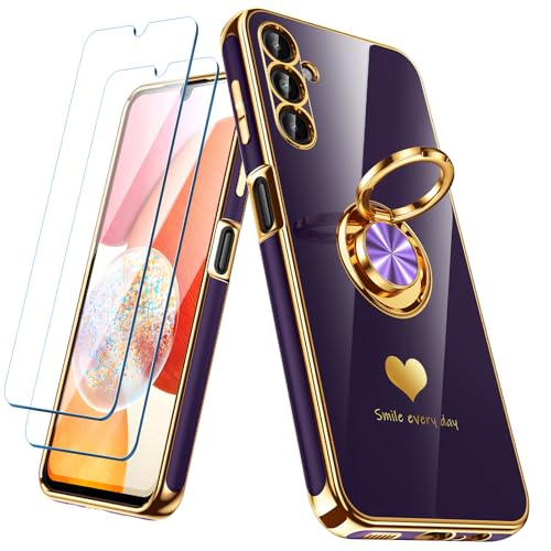 Nonional for Samsung Galaxy A14 5G/4G Case with 2 Pack Screen Protector, 360° Rotatable Ring Holder [Luxury Hearts Pattern] Plating Gold Edge Slim Soft Phone Cover Case for Galaxy A14 - Purple