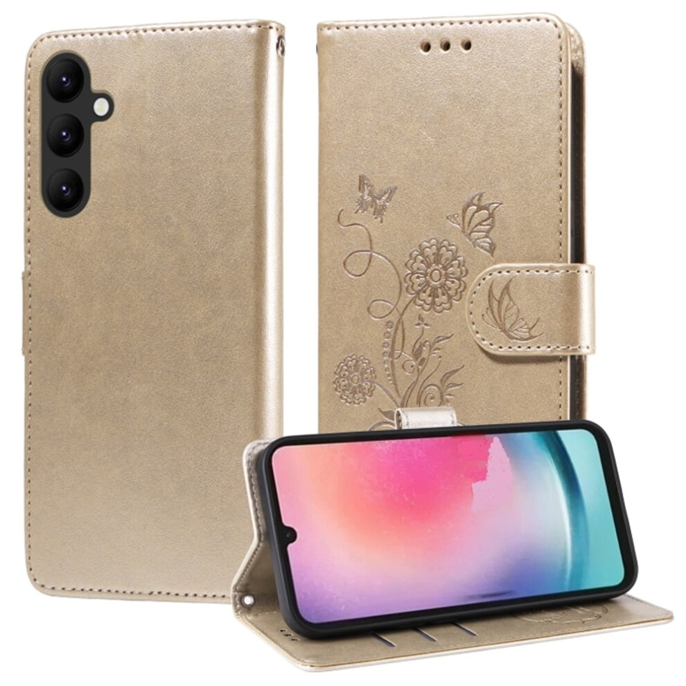 Shockproof flip leather phone case with card slots & cash compartment for Samsung Galaxy A24 5G, gold butterfly flowers design
