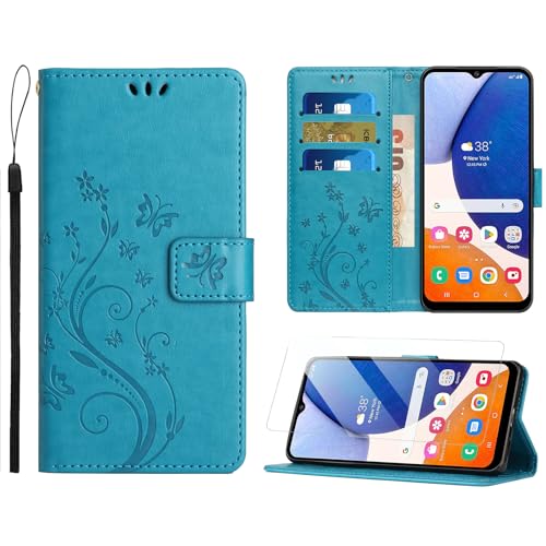 ANSHOW for Samsung Galaxy A35 Wallet Case with Wrist Strap, with Screen Protector, Flip Leather Case with Cards Holder Phone Case with Kickstand Cover for Samsung A35, Blue