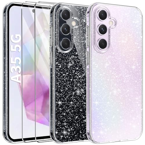 AROYI 3 in 1 Clear Glitter Case for Samsung Galaxy A35 5G Case with 2 Tempered Glass Screen Protector, Soft Bumper Anti-Scratch Sparkle Bling Women Girls Samsung Galaxy A35 Phone Case Cover