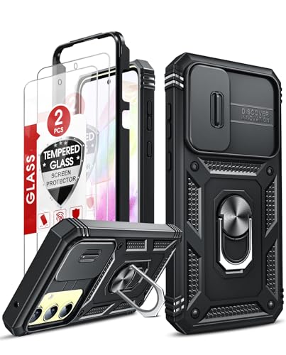 LeYi for Samsung Galaxy A35 5G Case with Camera Cover Slider, 360 Full Body Armour Phone Cover Tough Hard Protective | 2 Pack Tempered Glass Screen Protector | Ring Stand Holder for Samsung A 35 Black
