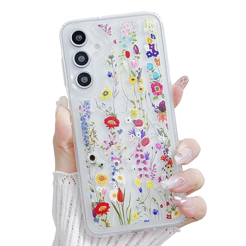 LSEEKA for Samsung Galaxy A35 Clear Case with Pressed Real Dried White Flower Design,Transparent Glitter Cute Floral Slim Soft TPU Protective Phone Cover for Samsung Galaxy A35