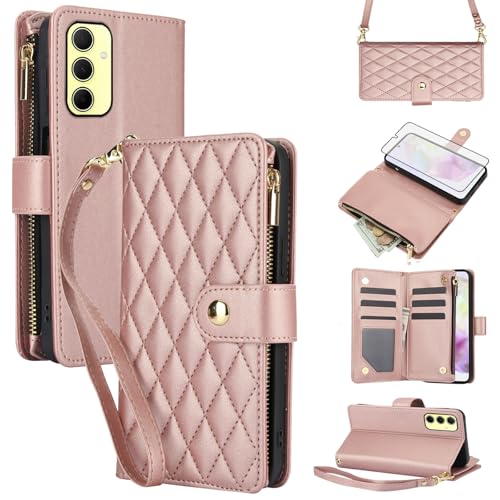 Asuwish Phone Case for Samsung Galaxy A35 5G with Tempered Glass Screen Protector and Zipper Wallet Cover Card Holder Slot Stand Flip Wrist Strap Cell Accessories A 35 35A A355G Women Men Rose Gold