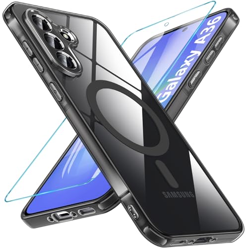 for Samsung A36 5G Case, Magnetic Phone Case for Samsung Galaxy A36 with Screen Protector, Shockproof Military Grade Protection, Non-Yellowing Anti-Scratch Transparent Back Rugged Bumper Cover, Black