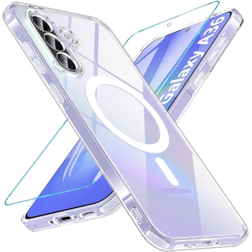 for Samsung A36 5G Case, Magnetic Phone Case for Samsung Galaxy A36 with Screen Protector, Shockproof Military Grade Protection, Non-Yellowing Anti-Scratch Transparent Back Rugged Bumper Cover,Clear