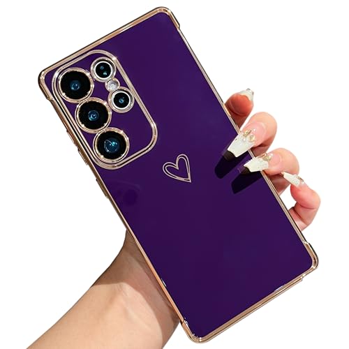 ZTOFERA Compatible with Samsung Galaxy S24 Ultra 5G (6.8") Case for Girls Women, Flexible Silicone Protective Phone Case with Cute Love Heart Pattern Plated Trim Shockproof Bumper Cover, Dark Violet