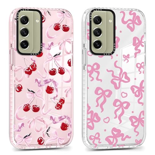 Yomjew 2 Pack Cute Clear Bow Phone Case for Samsung Galaxy S21 FE 5G 6.4", Aesthetic Trendy Fashion Case Soft Slim Protective Shockproof TPU Bumper Cover for Women Girls - Bow Cherry
