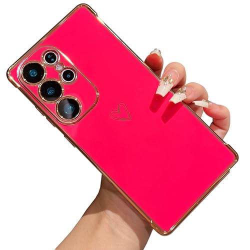 ZTOFERA Compatible with Samsung Galaxy S24 Ultra 5G (6.8") Case for Girls Women, Flexible Silicone Protective Phone Case with Cute Love Heart Pattern Plated Edging Shockproof Bumper Cover, Hot Pink