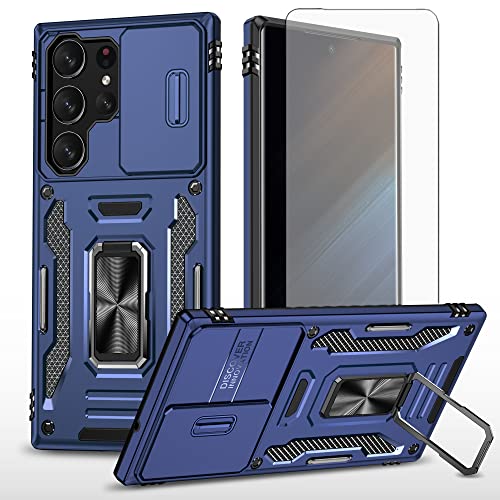 Asuwish Phone Case for Samsung Galaxy S23 Ultra 5G with Tempered Glass Screen Protector and Slide Camera Cover Magnetic Ring Holder Kickstand S23Ultra 23S S 23 23Ultra SM 6.8 inch Women Men Navy Blue