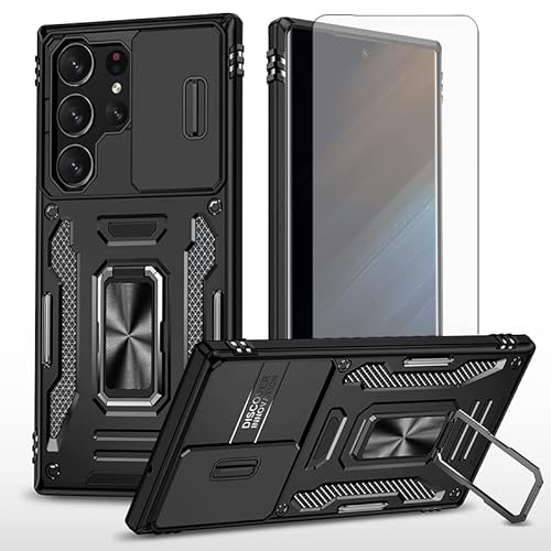 Asuwish Phone Case for Samsung Galaxy S23 Ultra 5G with Tempered Glass Screen Protector and Slide Camera Cover Magnetic Ring Holder Kickstand S23Ultra 23S S 23 23Ultra SM 6.8 inch Women Men Black