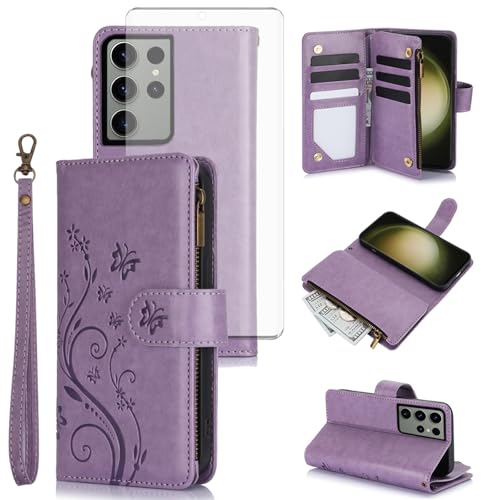 Asuwish Phone Case for Samsung Galaxy S23 Ultra 5G Wallet Cell Cover with Screen Protector Wrist Strap Flower Flip Zipper Card Holder Slot Stand S23Ultra 23S S 23 23Ultra Women Girls Purple