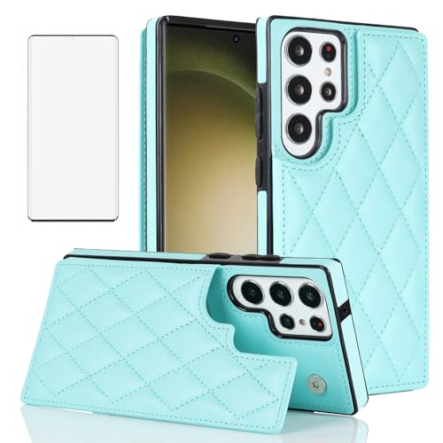 Asuwish Phone Case for Samsung Galaxy S23 Ultra 5G Wallet Cover with Tempered Glass Screen Protector and Leather RFID Credit Card Holder Stand Cell S23Ultra 23S S 23 23Ultra 6.8 inch Women Mint Green