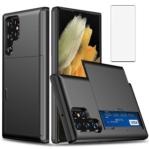Asuwish Phone Case for Samsung Galaxy S23 Ultra 5G with Screen Protector Cover and Accessories Card Holder Slot Cell TPU Slim Hybrid Protective S23Ultra 23S S 23 23Ultra 6.8 inch Women Men Black