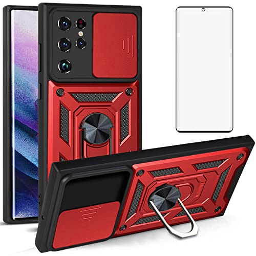 Asuwish Phone Case for Samsung Galaxy S23 Ultra 5G with Slide Camera Cover and Screen Protector Hard Stand Ring Holder Hybrid Slim Cell Accessories S23Ultra 23S S 23 23Ultra 6.8 inch Women Men Red