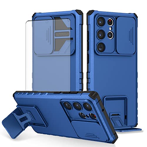 Asuwish Phone Case for Samsung Galaxy S23 Ultra 5G with Tempered Glass Screen Protector and Slide Camera Cover Kickstand Stand Slim Protective Cell S23Ultra 23S S 23 23Ultra 6.8 inch Women Men Blue