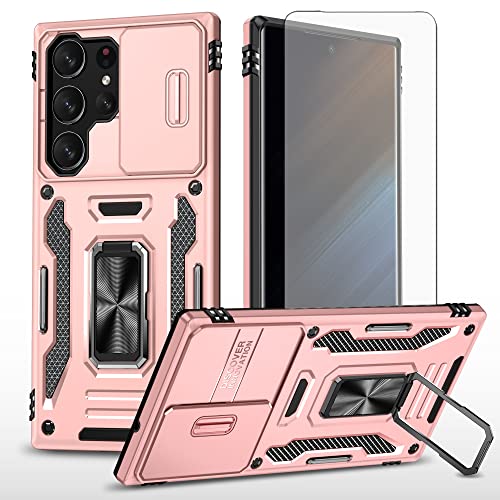 Asuwish Phone Case for Samsung Galaxy S23 Ultra 5G with Tempered Glass Screen Protector and Slide Camera Cover Magnetic Ring Holder Kickstand S23Ultra 23S S 23 23Ultra SM 6.8 inch Women Men Rose Gold