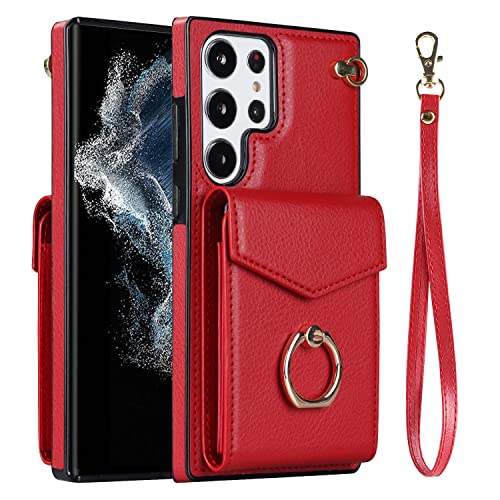 Asuwish Phone Case for Samsung Galaxy S23 Ultra 5G Wallet Cover with Tempered Glass Screen Protector and RFID Blocking Ring Credit Card Holder Cell S23Ultra 23S S 23 23Ultra 6.8 inch Women Men Red