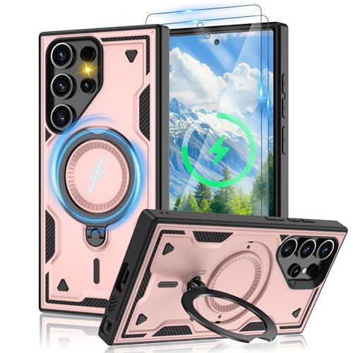 Jshru 3 in 1 Magnetic for Samsung S23 Ultra Case | S22 Ultra Case,Compatible with MagSafe | Built-in Stand | 2 Pack HD Screen Protector,Shockproof Protective Cover for Galaxy S22/S23 Ultra,Rose Gold
