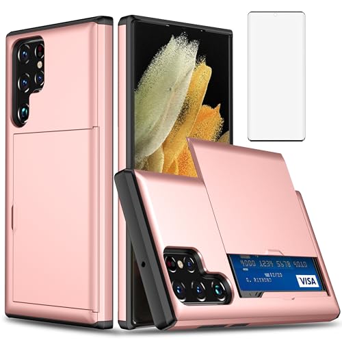 Asuwish Phone Case for Samsung Galaxy S23 Ultra 5G with Screen Protector Cover and Accessories Card Holder Slot Cell TPU Slim Hybrid Protective S23Ultra 23S S 23 23Ultra 6.8 inch Women Men Rose Gold
