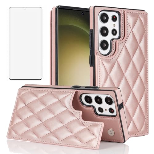 Asuwish Phone Case for Samsung Galaxy S23 Ultra 5G Wallet Cover with Tempered Glass Screen Protector and Leather RFID Credit Card Holder Stand Cell S23Ultra 23S S 23 23Ultra 6.8 inch Women Rose Gold