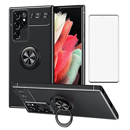 Compatible with Samsung Galaxy S23 Ultra 5G Phone Case and Tempered Glass Screen Protector With Ring Holder Stand Kickstand Silicone Gaxaly S23ultra 23S S 23 23ultra G5 Cover for Women Men Black