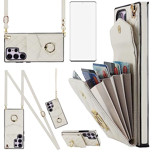 Asuwish Phone Case for Samsung Galaxy S23 Ultra 5G Wallet Cover with Tempered Glass Screen Protector Wrist Strap Ring RFID Blocking Card Holder Cell S23Ultra 23S S 23 23Ultra 6.8 inch Women Off White