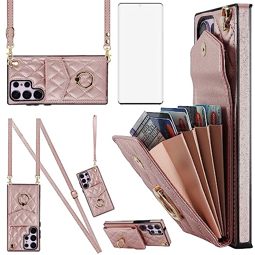 Asuwish Phone Case for Samsung Galaxy S23 Ultra 5G Wallet Cover with Tempered Glass Screen Protector Wrist Strap Ring RFID Blocking Card Holder Cell S23Ultra 23S S 23 23Ultra 6.8 inch Women Rose Gold