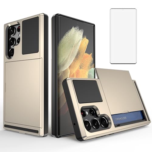 Asuwish Phone Case for Samsung Galaxy S23 Ultra 5G with Screen Protector Cover and Card Holder Slot Hybrid Full Body Protective Shockproof Cell S23Ultra 23S S 23 23Ultra 6.8 inch Women Men Gold