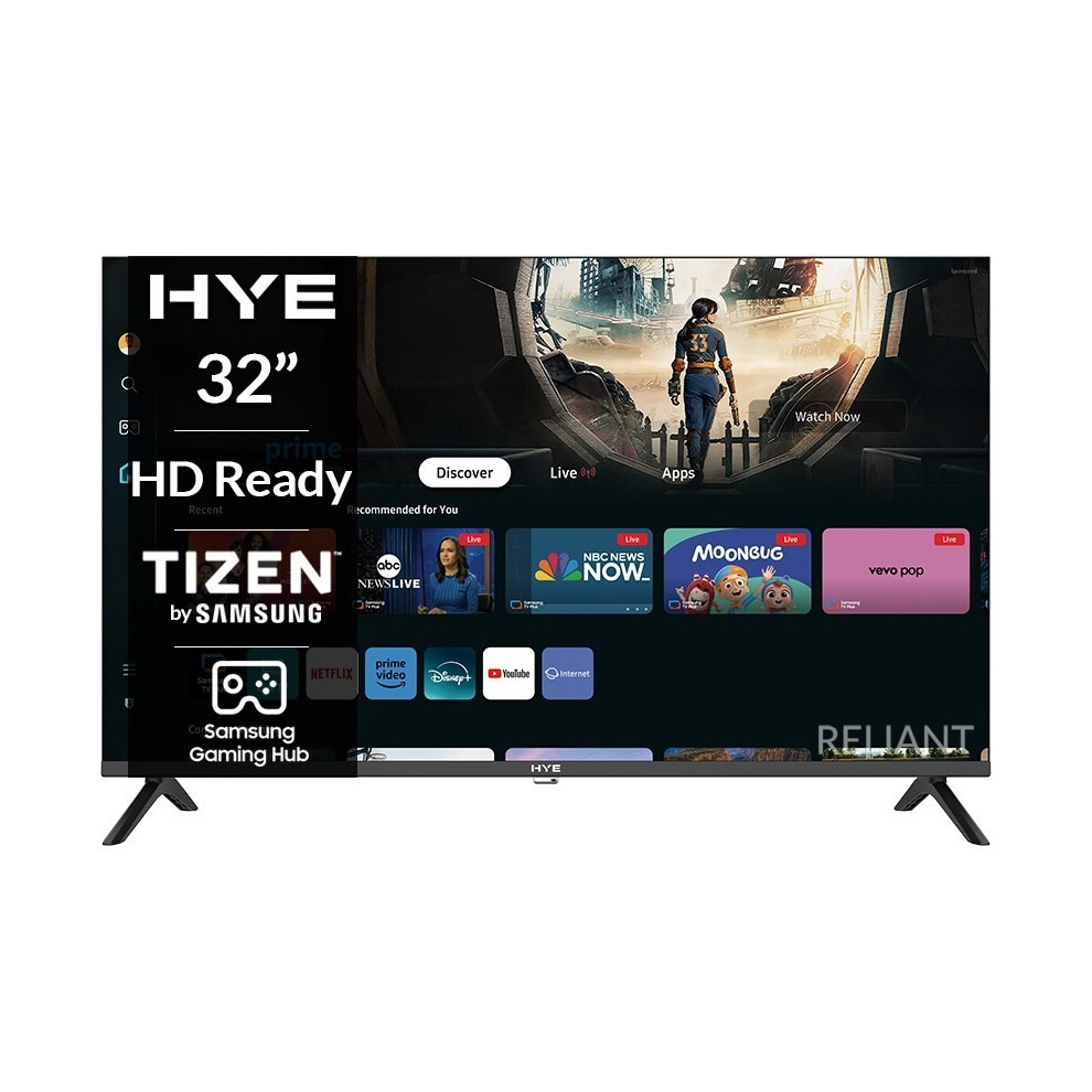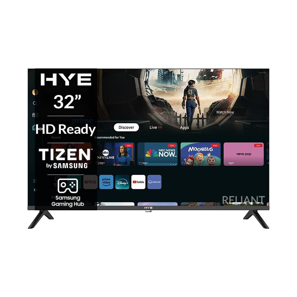 HYE 32 inch smart tv with HD Ready display, frameless design, WiFi, Bluetooth, Samsung Tizen OS, Gaming Hub, tv streaming apps & HDMI connectivity