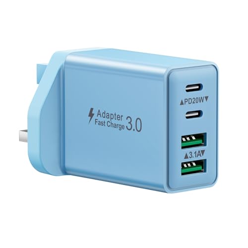 USB C Charger UK 4 Port,45W Travle Plug Adapter with 2 USBC and 2 USB A Ports, Multiport Fast Wall Charger for iPhone, Samsung Galaxy, iPad, Android Phones(Blue, 30W 2C2A)