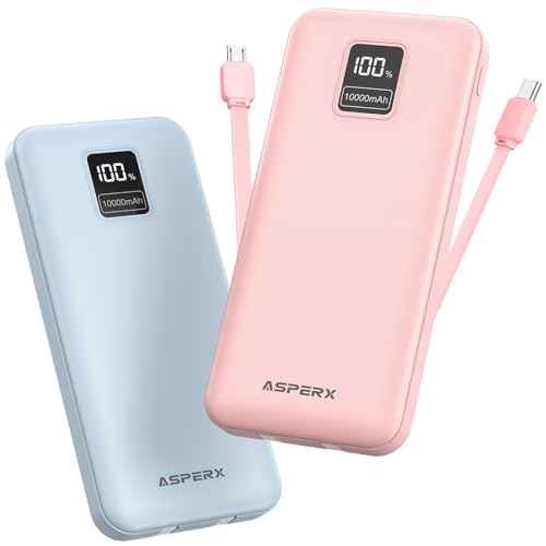 AsperX 2-Pack 10000mAh Power Bank Fast Charging, Portable Charger with Built in Cables USB C Input and Output, Battery Pack LED Display Compatible with iPhone, Samsung, iPad, Tablets, Android, etc.