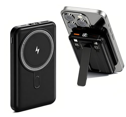 Power Bank, Magnetic Wireless 10000mAh Fast Charging Portable Charger with Stand, 3 Outputs USB C in/Out PD 22.5W Battery Pack for iPhone 12 13 14 15 16 Samsung Android and More (Dark Black)
