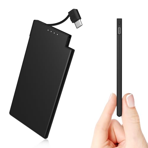 Auskang 5000mAh Power Bank with built-in Type-C Cable, Ultra Slim and Super Lightweight Portable Charger Small External Battery, Compatible with Samsung, Xiaomi, Sony, iPhone 15 Series, etc.- Black