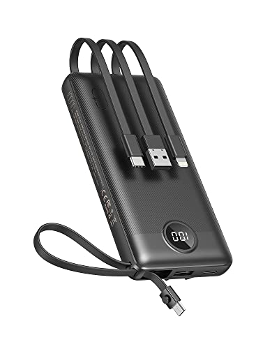 VRURC 10000mAh Power Bank With Built in Cables,USB C Battery Pack Portable Charger with 5 Outputs 2 Inputs Powerbank LED Display compatible with iPhone 14 13 12 Samsung S21 S20 Xiaomi iPad