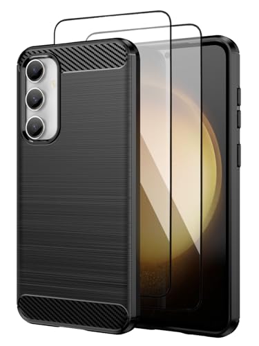 Teayoha for Samsung Galaxy S23 FE Phone Case, with Tempered Glass Screen Protector [2 Pack], Carbon Fiber Scratch Resistant, Shock Absorption Soft TPU Drawing Protective Cases Phone Cover - Black