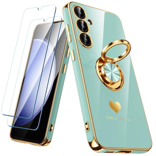 Nonional for Samsung Galaxy S23 FE 5G Case with 2 Pack Screen Protector, 360° Rotatable Ring Holder [Luxury Hearts Pattern] Plating Gold Edge Slim Soft Phone Cover Case for Galaxy S23 FE - Mint