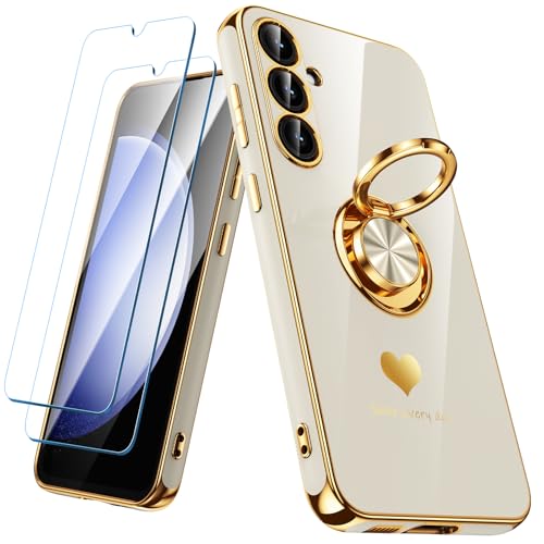 Nonional for Samsung Galaxy S23 FE 5G Case with 2 Pack Screen Protector, 360° Rotatable Ring Holder [Luxury Hearts Pattern] Plating Gold Edge Slim Soft Phone Cover Case for Galaxy S23 FE - White