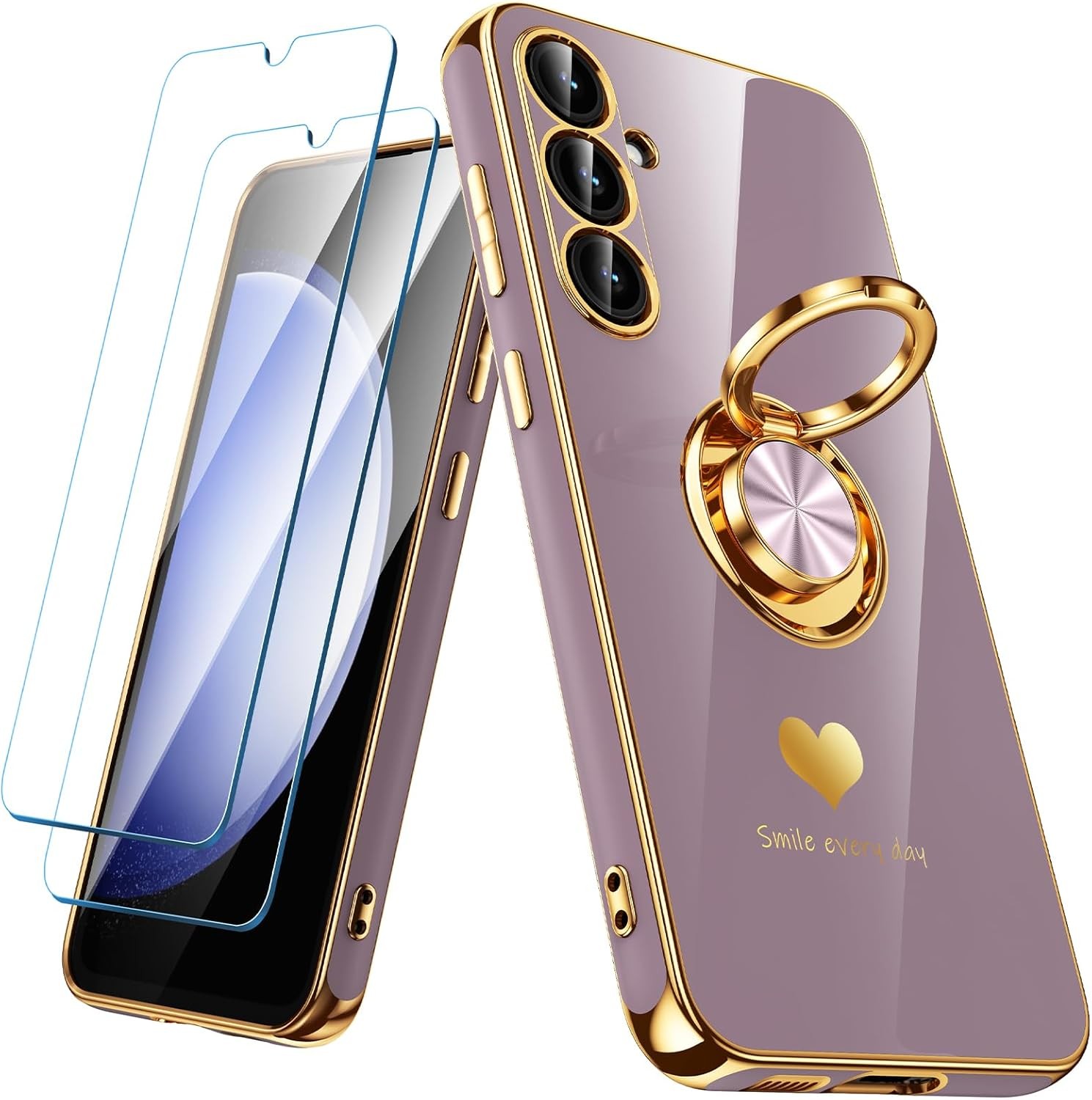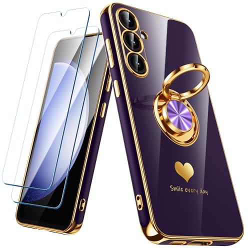 Nonional for Samsung Galaxy S23 FE 5G Case with 2 Pack Screen Protector, 360° Rotatable Ring Holder [Luxury Hearts Pattern] Plating Gold Edge Slim Soft Phone Cover Case for Galaxy S23 FE - Purple