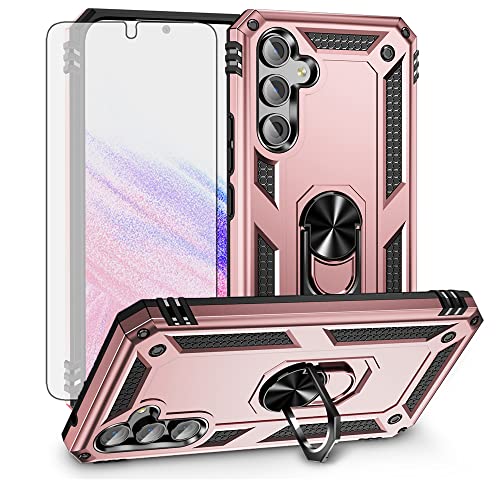 Asuwish Phone Case for Samsung Galaxy S23 FE 5G with Tempered Glass Screen Protector Cover and Stand Ring Holder Hard Shockproof Metal Heavy Duty Cell Accessories S 23 EF S23FE 23S Women Men Rose Gold
