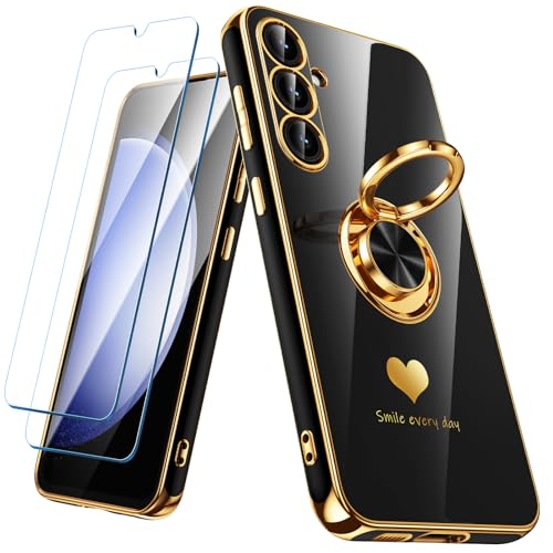 Nonional for Samsung Galaxy S23 FE 5G Case with 2 Pack Screen Protector, 360° Rotatable Ring Holder [Luxury Hearts Pattern] Plating Gold Edge Slim Soft Phone Cover Case for Galaxy S23 FE - Black