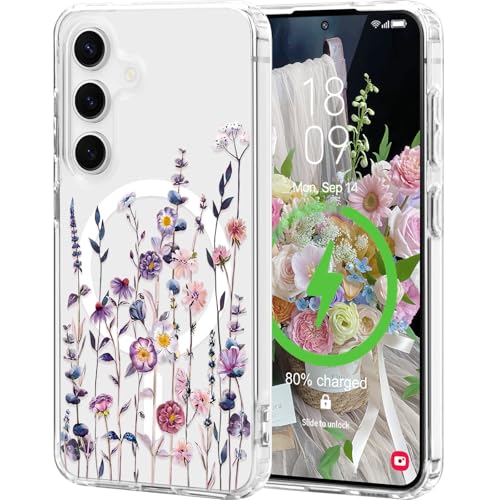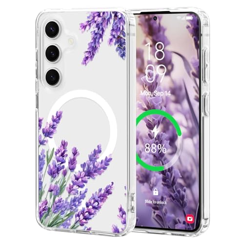 L-FADNUT Magnetic for Samsung Galaxy S25 Plus/S24 Plus Case, Compatible with Magsafe Floral Pattern Design Phone Case, Girly Flower Slim Clear Bumper Shockproof Cover for Girl Women, Lavender