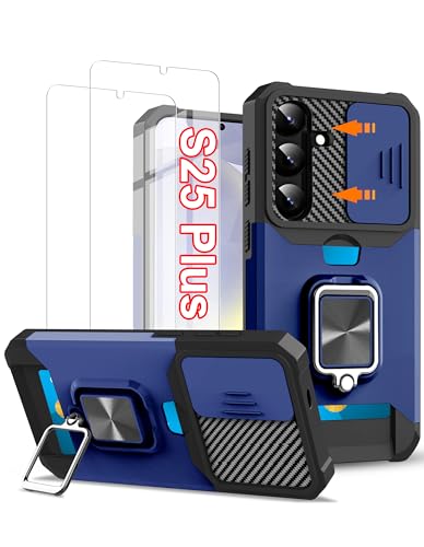Jusy for Samsung Galaxy S25 Plus Case Wallet & 2 Screen Protectors, with Slide Camera Cover, Card Holder Slot and Magnetic Kickstand, Heavy Duty Case Military Grade Cover for Samsung S25 Plus, Navy