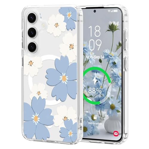 L-FADNUT Magnetic for Samsung Galaxy S25 Plus/S24 Plus Case, Compatible with Magsafe Floral Pattern Design Phone Case, Girly Flower Slim Clear Bumper Shockproof Cover for Girl Women, Blue