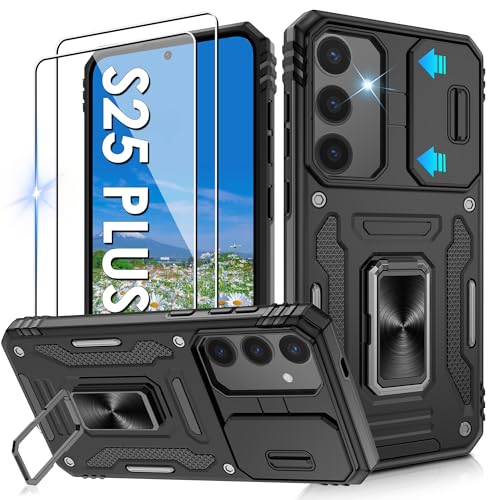 Jshru for Samsung S25 Plus Case with Screen Protector | Camera Protective Cover | Ring Stand,S25 + Phone Case for Men and Women | Shockproof Bumper Phone Cover for Samsung Galaxy S25 Plus,Black