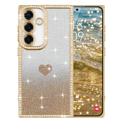 ROSEHUI for Samsung Galaxy S25 Plus Case Glitter,Rectangle Clear Sparkly Phone Case with Bling Rhinestone Cute Heart Pattern Glitter Paper,Camera Protective TPU Shockproof Cover for Women Girls,Gold